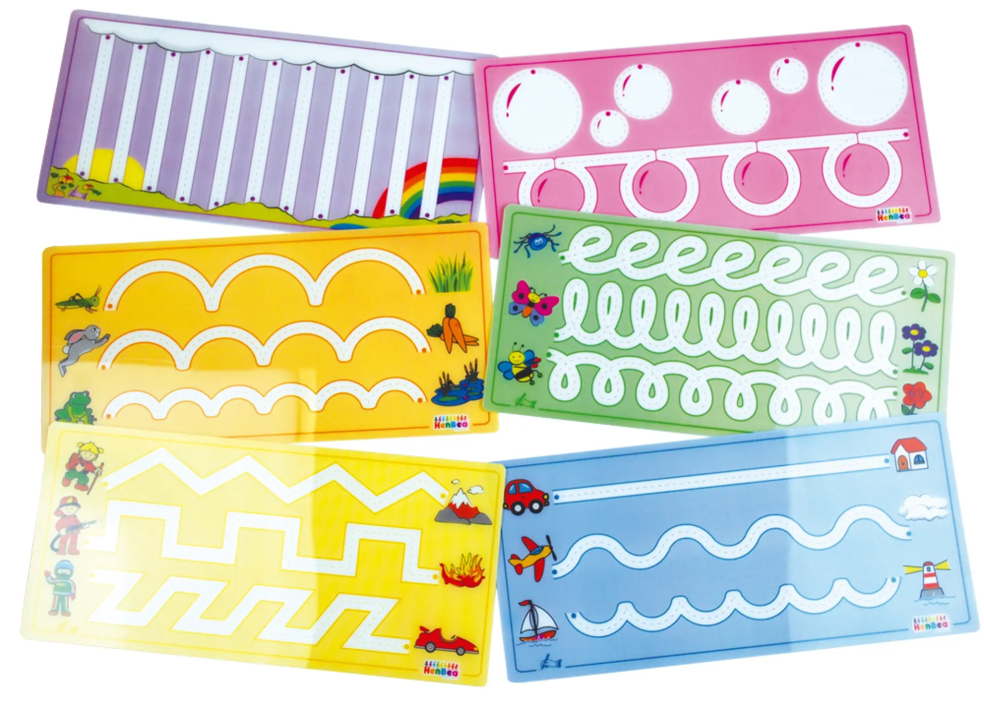 Šest plastičnih kartica za suho brisanje i trokutasti marker koji omogućuju vježbanje najvažnijih linija za pravilni razvoj pisanja.